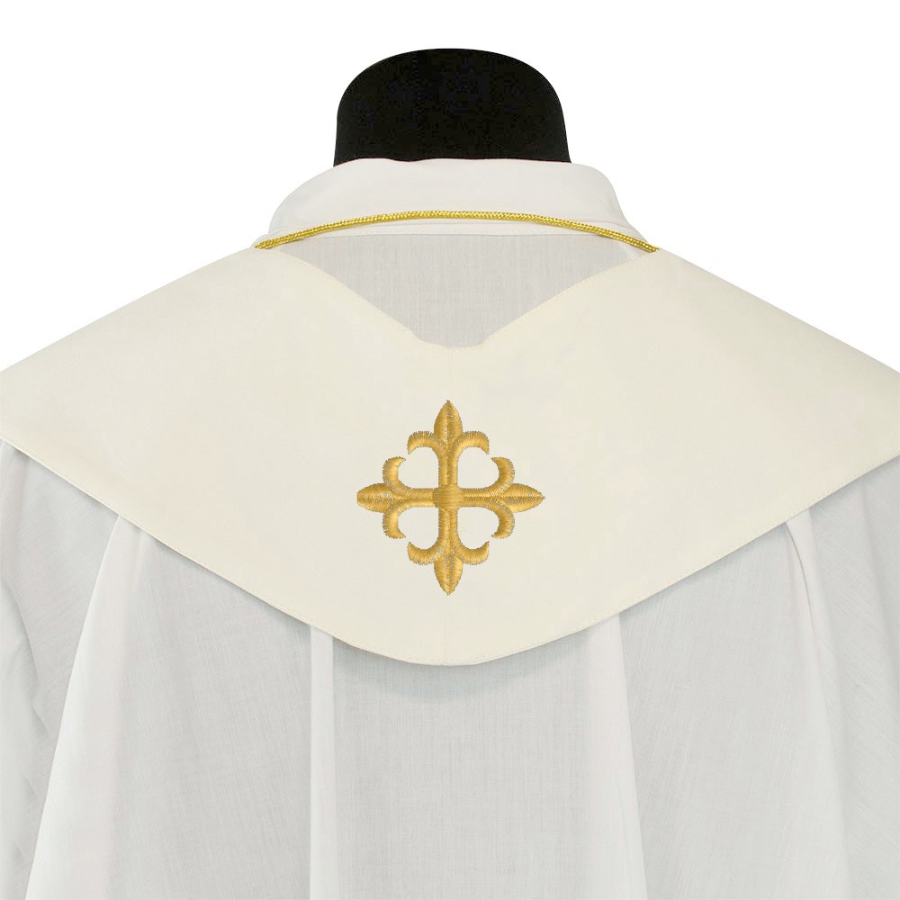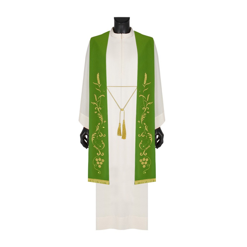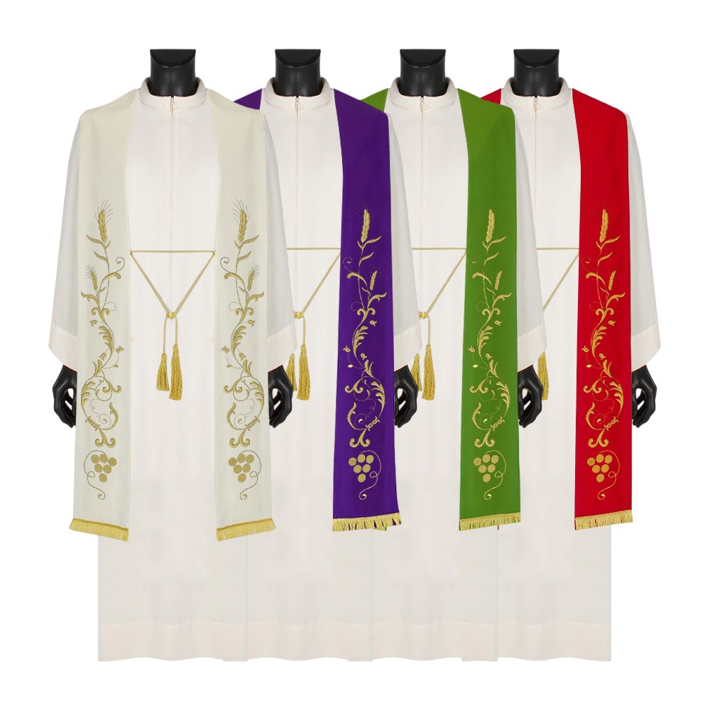 La stola è realizzata in tessuto poliestere, arricchita con frangia dorata e cordoniera con fiocchi. Questo prodotto è realizzato da una sartoria italiana. Disponibile nei colori liturgici. Scegli il colore che preferisci nel menù a tendina!