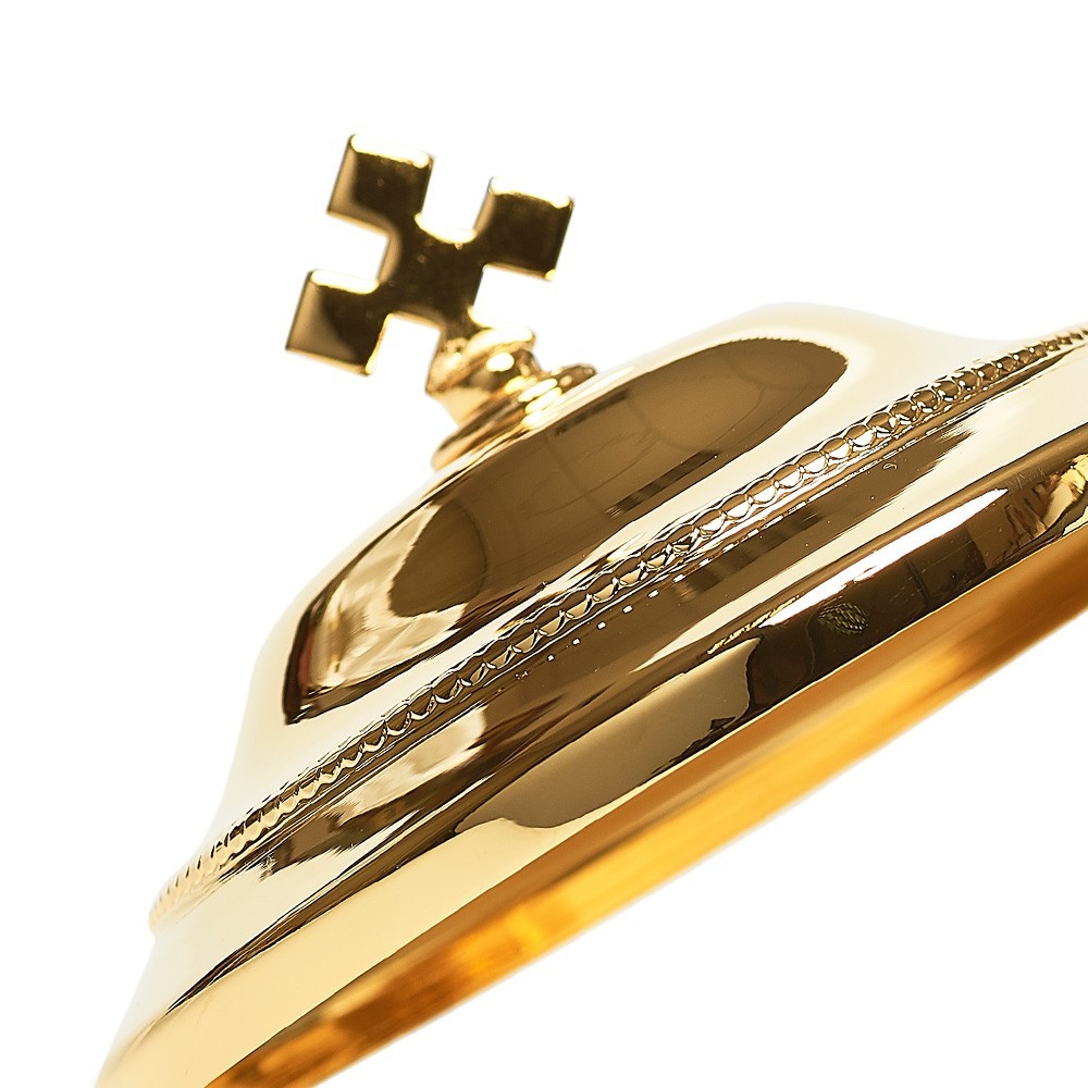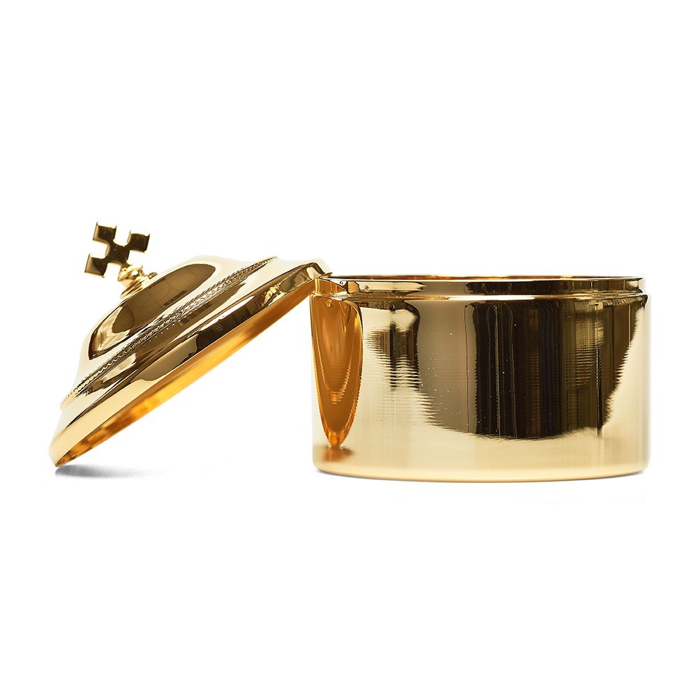 Scatola per portaostie realizzata interamente in ottone dorato lucido. Sul coperchio vi è applicata una piccola croce.