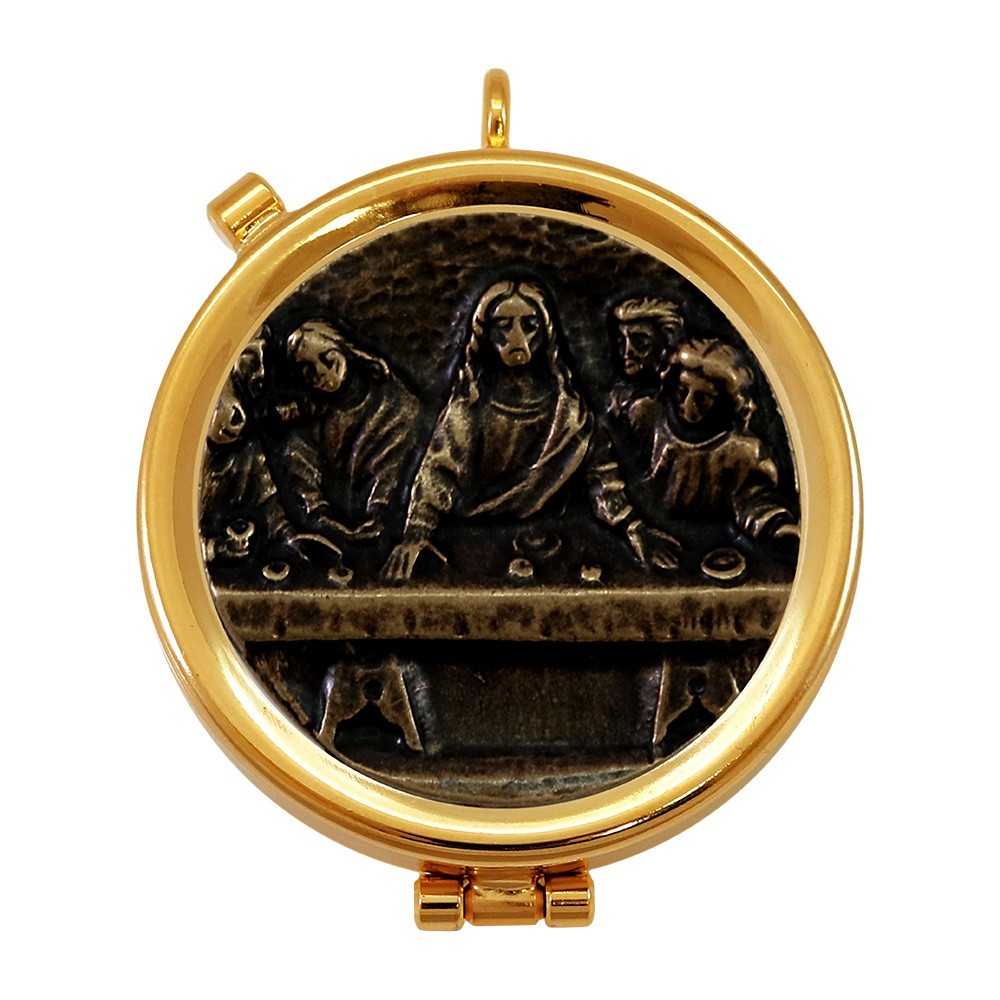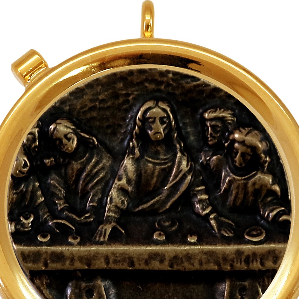 Porta ostie in ottone dorato con placca in rilievo "Ultima Cena" realizzata con finitura in bronzo antico. La teca è completa di anello per appenderla al collo e può contenere circa 12 particole.
